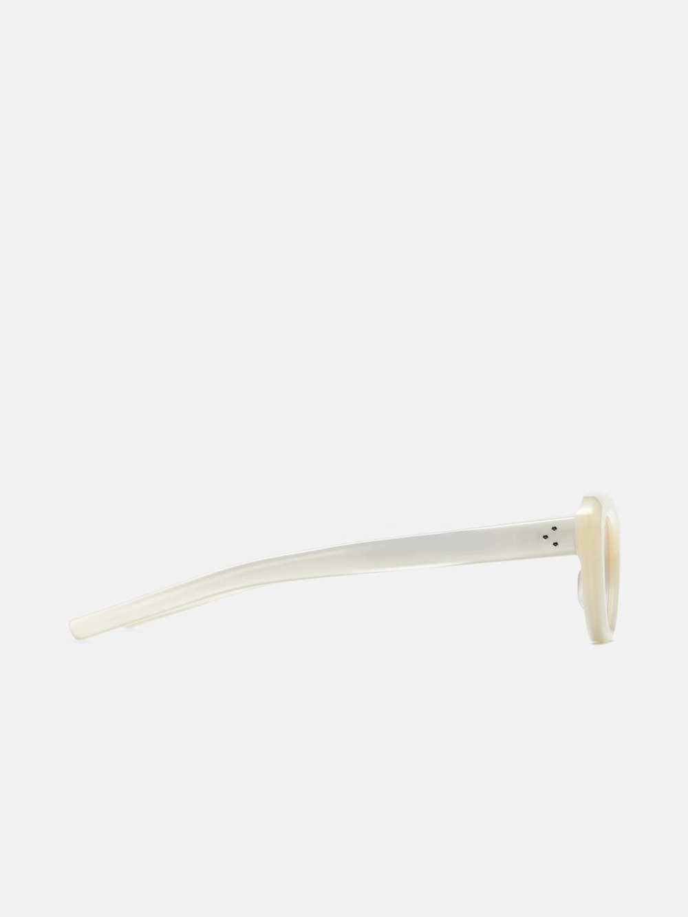 Off Broadway's 2025 collection features the 'LOBSTER' sunglasses, characterized by a cat-eye shape and a bold, thick design. The three circular rivet details on the sleek temples add an elegant touch, while the logo detail placed on one side completes the sophisticated look.