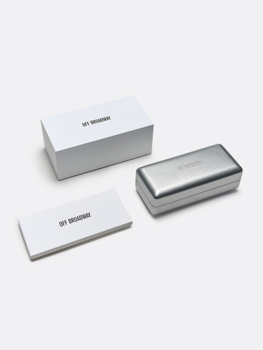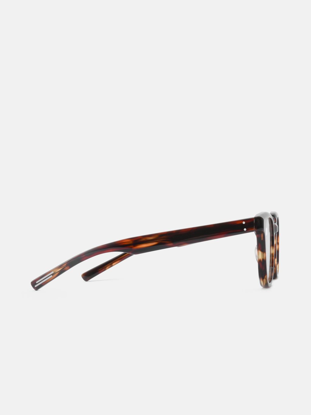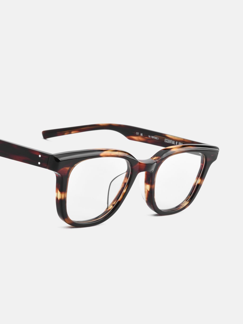 The Essential N 001 eyewear features a classic square shape with sculptural details at the top of the front and the bridge corners, expressing a modern and elegant aesthetic. Straight temples with classic silver accents and engraved silver signature line details at the temple tips add a contemporary touch.