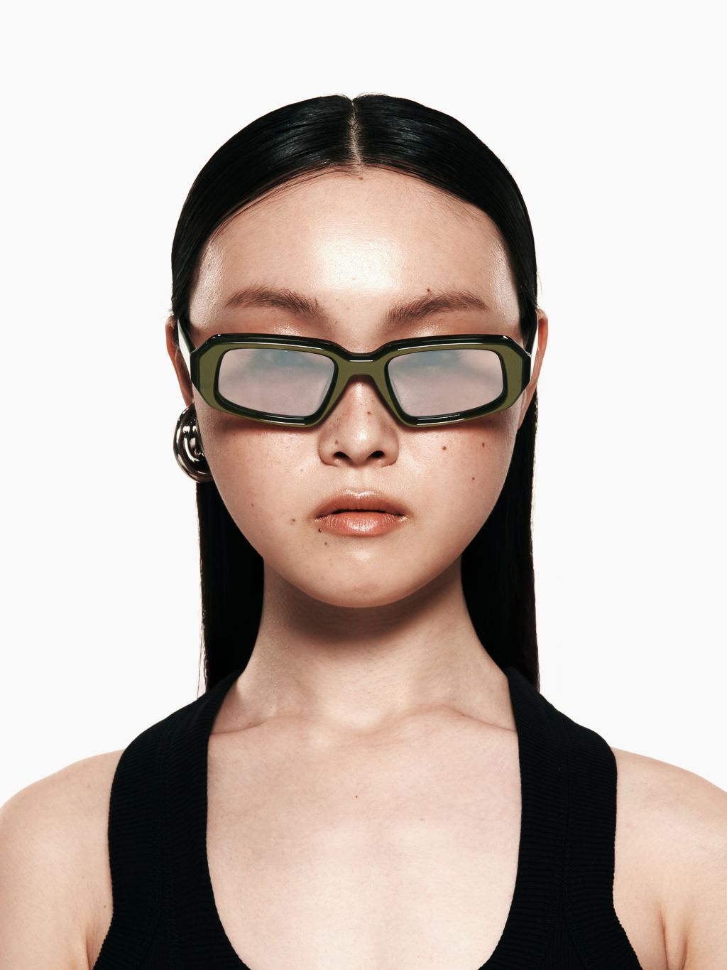 The FIVE FIVE FIVE sunglasses feature a design that seamlessly combines oversized square and cat-eye shapes. Straight temples are accented with a logo detail and octagonal rivets, adding a refined touch to the overall look.