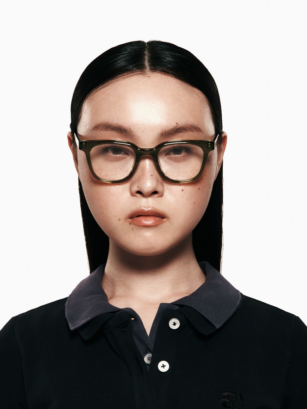 The Essential N 001 eyewear features a classic square shape with sculptural details at the top of the front and the bridge corners, expressing a modern and elegant aesthetic. Straight temples with classic silver accents and engraved silver signature line details at the temple tips add a contemporary touch.