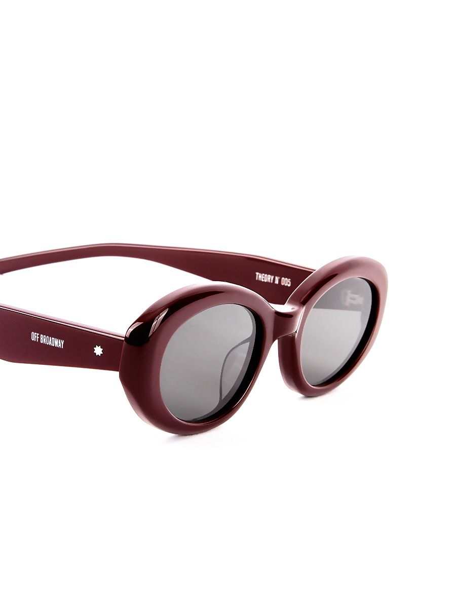 This design features a voluminous oval silhouette with an elegant wine-colored acetate frame. The rounded detailing on the front corners adds a sophisticated touch, while the bold temples, adorned with the Off Broadway logo and metal accents, enhance the stylish mood.