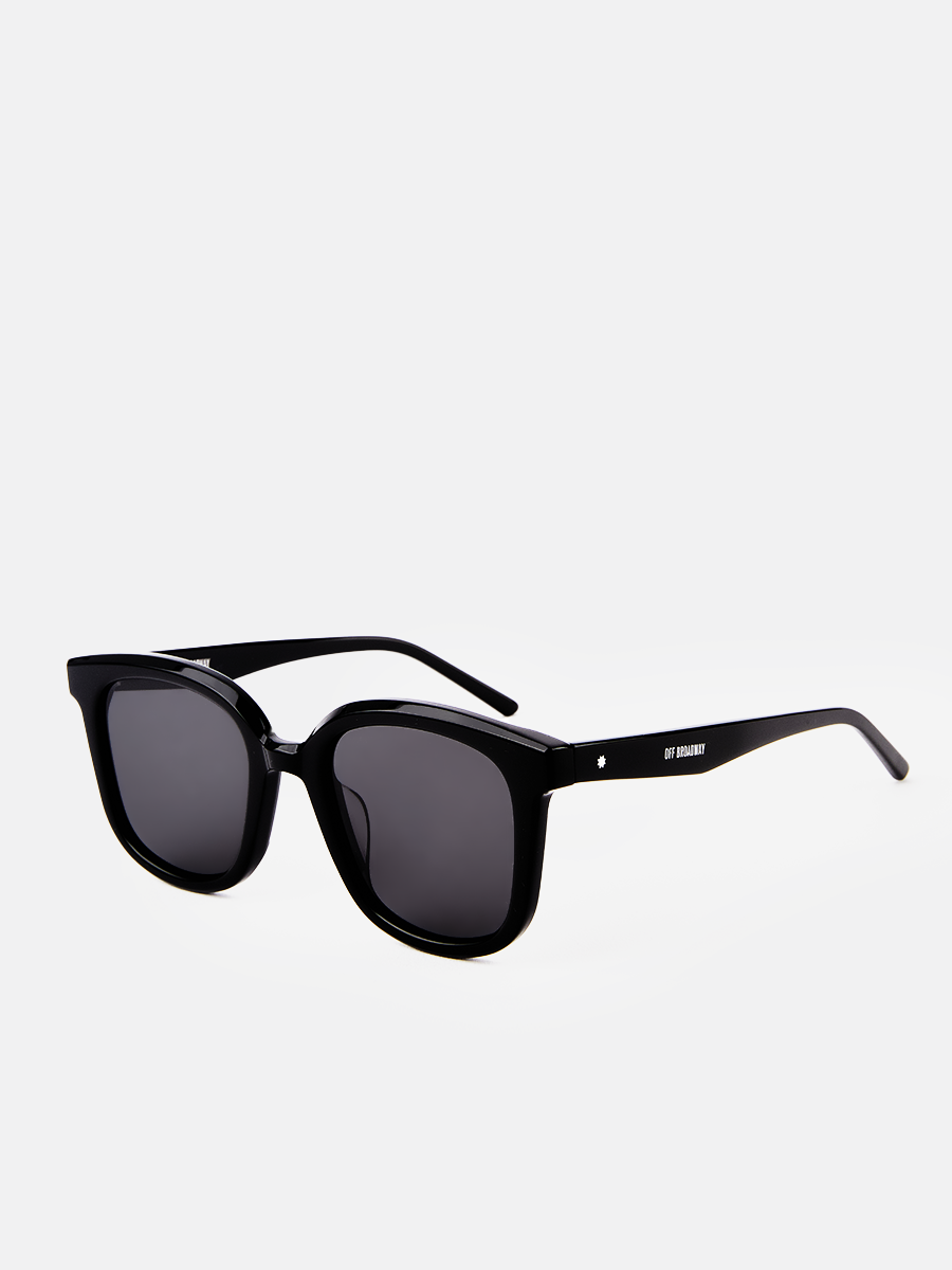 The oversized square silhouette features an all-black frame. The front upper corners are beveled at an angle, creating a sculptural and dimensional detail. Slim, straight temples are enhanced with an 'Off-Broadway' logo and metal embellishments for a sophisticated touch.